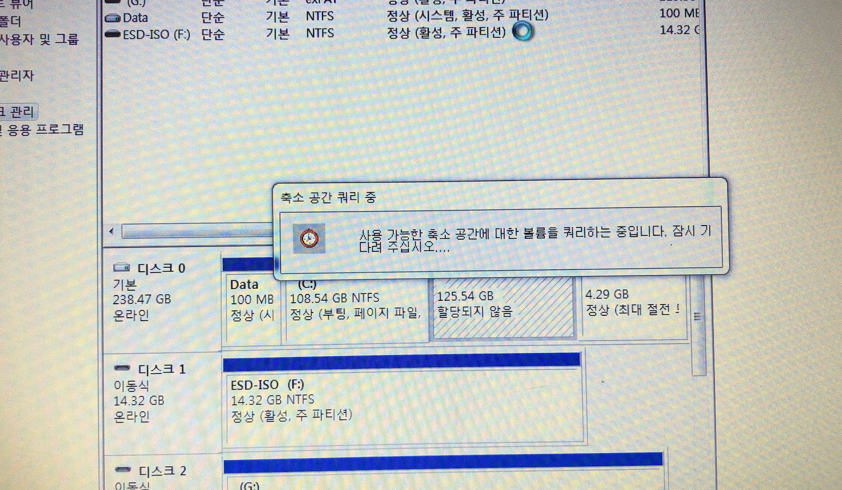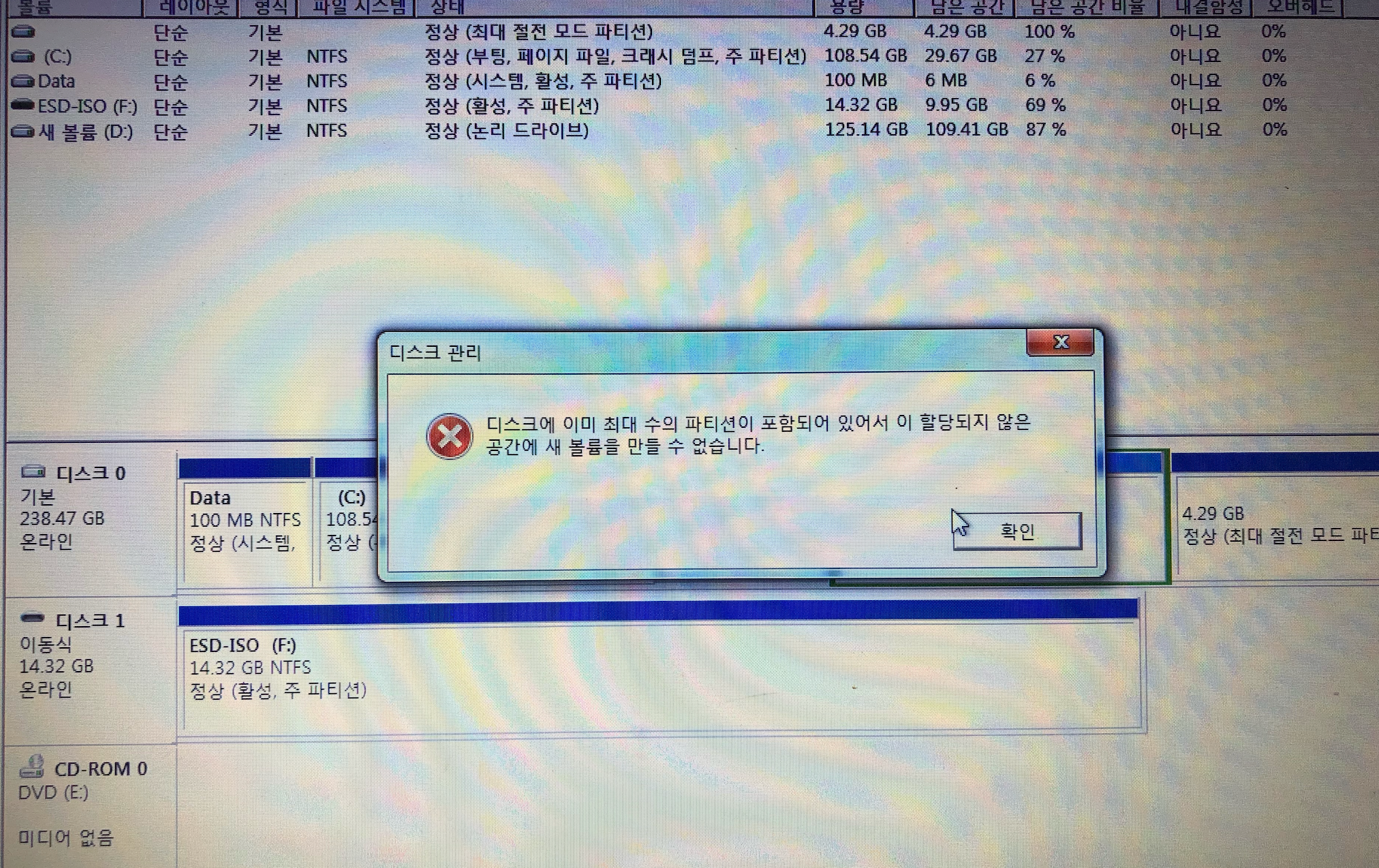 이미 파티션이 Data, C:, D:, 최대 절전 모드 데이터 보관 파티션으로 쪼개져 있다 보니 추가로 파티션이 생성이 잘 안되더군요.