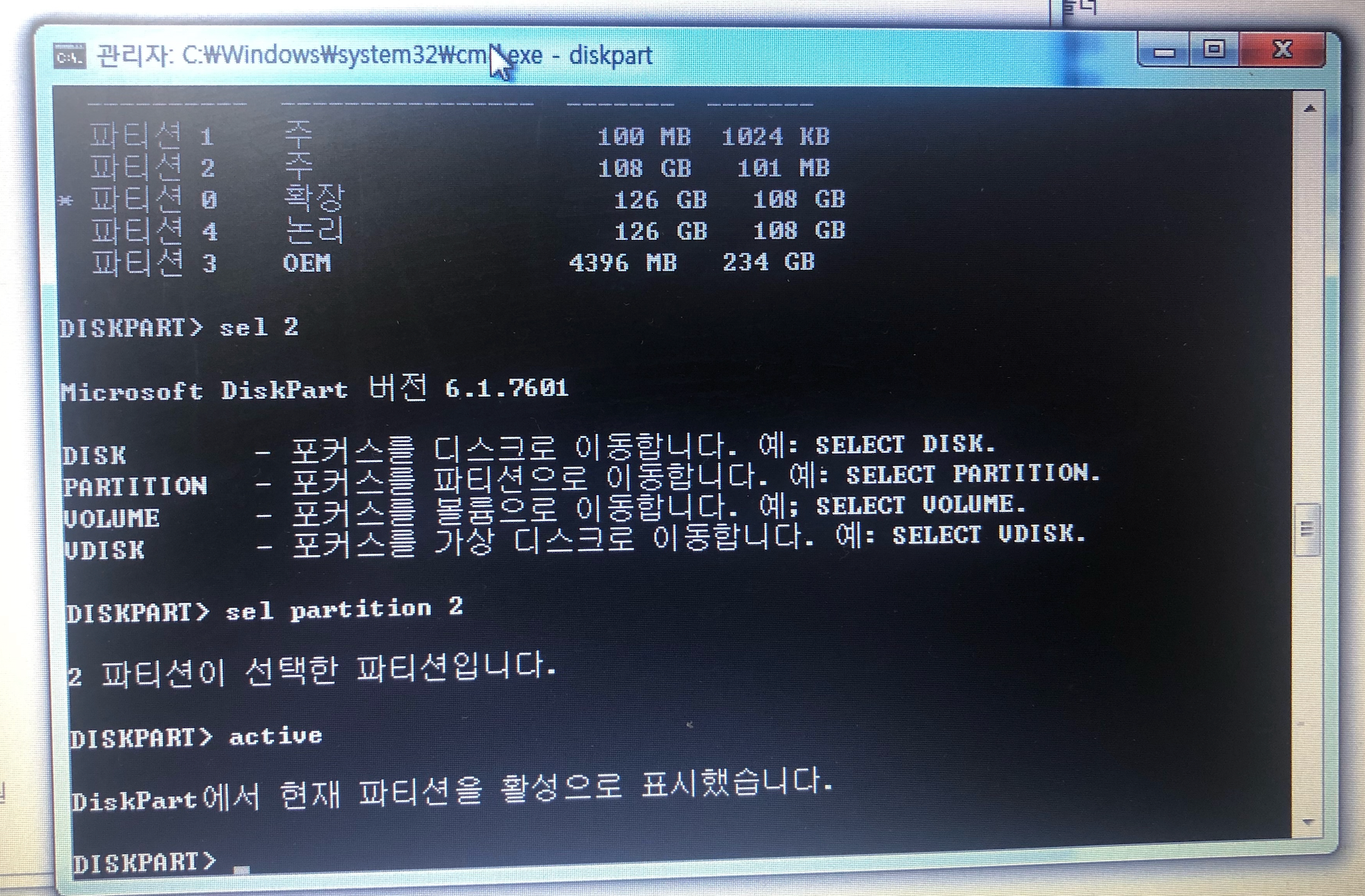 diskpart 명령어로 활성 파티션으로 만들었습니다.