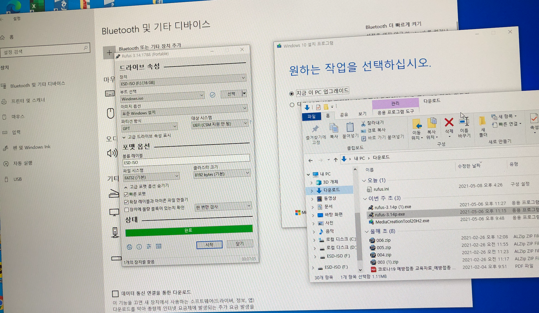 윈도우10 설치 USB를 다시 만듭니다. 앞서 파티션 방식 MBR로 만들었던 건 인식을 못하더군요. GPT방식으로 다시 만들었습니다.