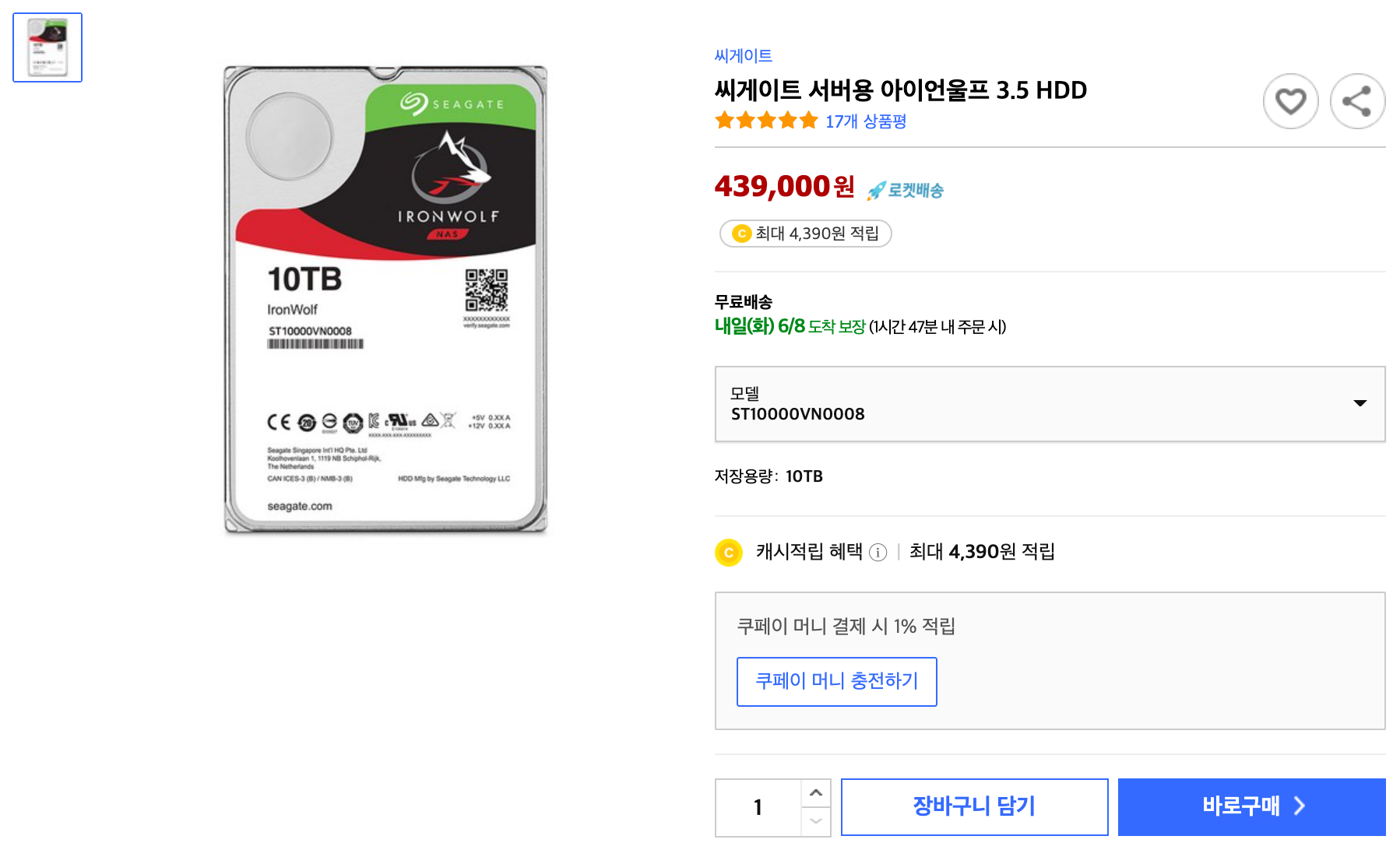 HDD는 처음에 4TB 4개 구성으로 RAID5를 생각해봤었는데요. 이건 좀 마음이 왔다 갔다 합니다. 지금은 처음에는 RAID5 안 쓰고 10TB 하나만 쓰다가 차츰 하나씩 늘여 가는 방식도 생각해 보는데요.