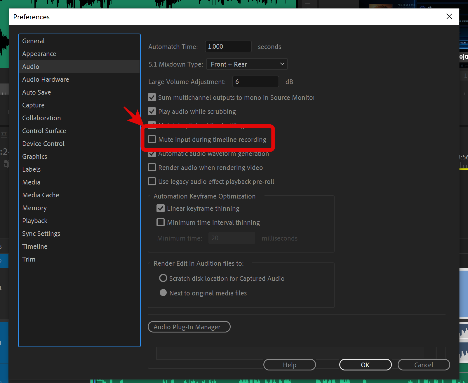 "Mute input during timeline recording"을 선택해 주면 녹음 중인 소리가 재생되는 것을 막을 수 있습니다.