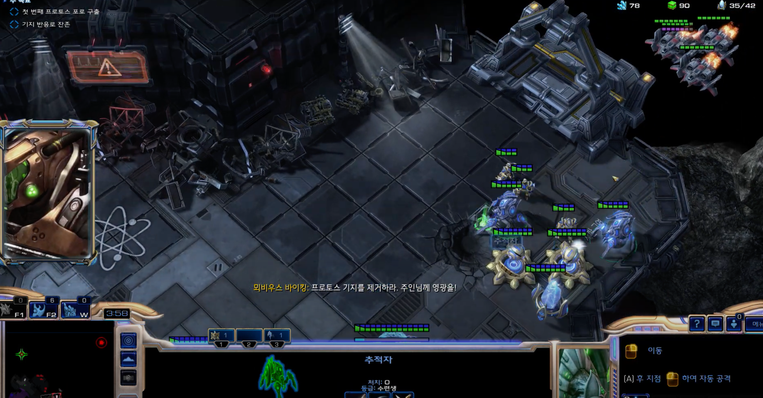 추적자를 이용해서 저그 군단을 유인해서 뫼비우스 재단 테란 병력을 처리하는 것이 좋습니다.