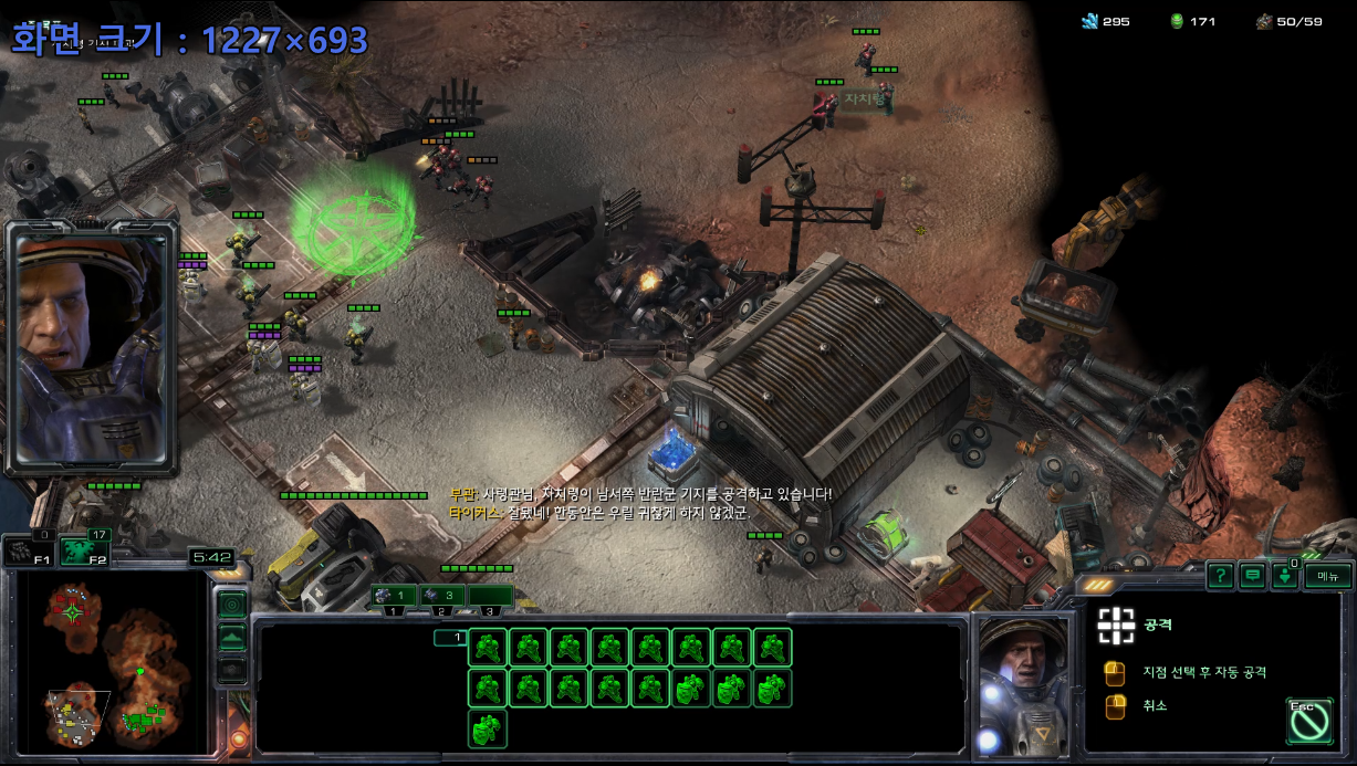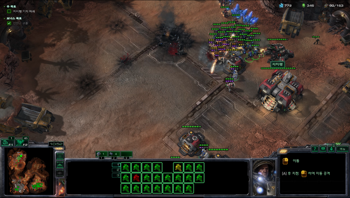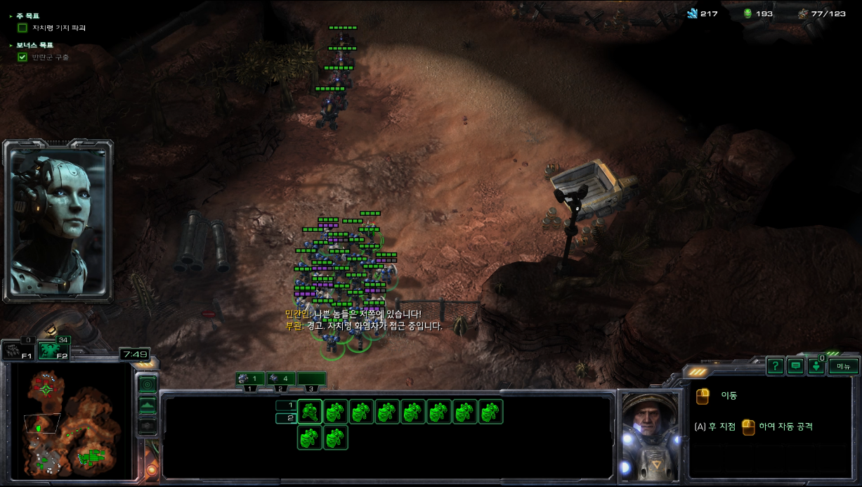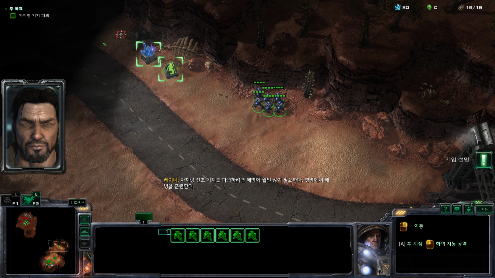 스타크래프트 2 첫 번째 임무인 "해방의 날"입니다. 아주 어려움으로 클리어해 보았습니다. 레이너와 해병 5명이 비행기에서 내립니다. 적 병력 3명을 먼저 유인해서 처리합니다. 안쪽에 있는 한