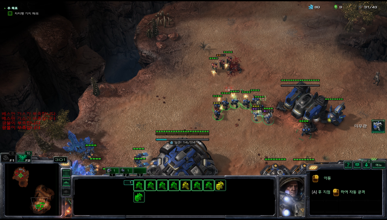 시작한 지 3분 정도가 되면 해병 5명이 공격 들어오네요. 의무관을 뽑아 두면 병력 손실 없이 처리할 수 있습니다.