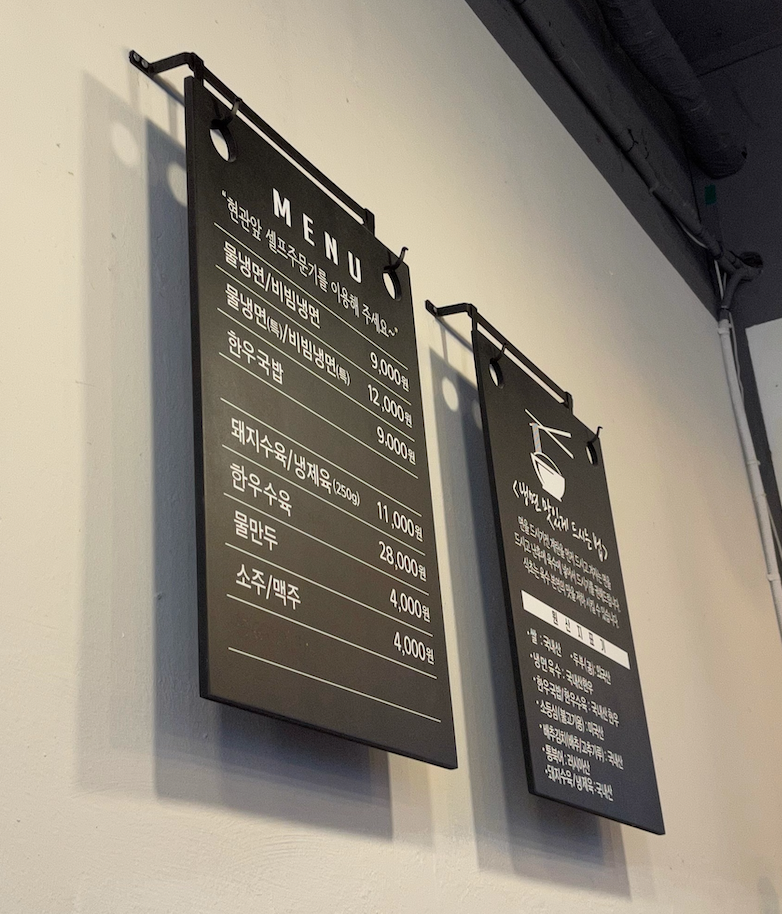 물냉면, 한우국밥, 돼지수육을 시켰습니다. 주문은 키오스크로 해야 합니다. 셰프 혼자 운영하는 방식이고 서빙 알바 한 분이 일하시는 작은 식당이었습니다.