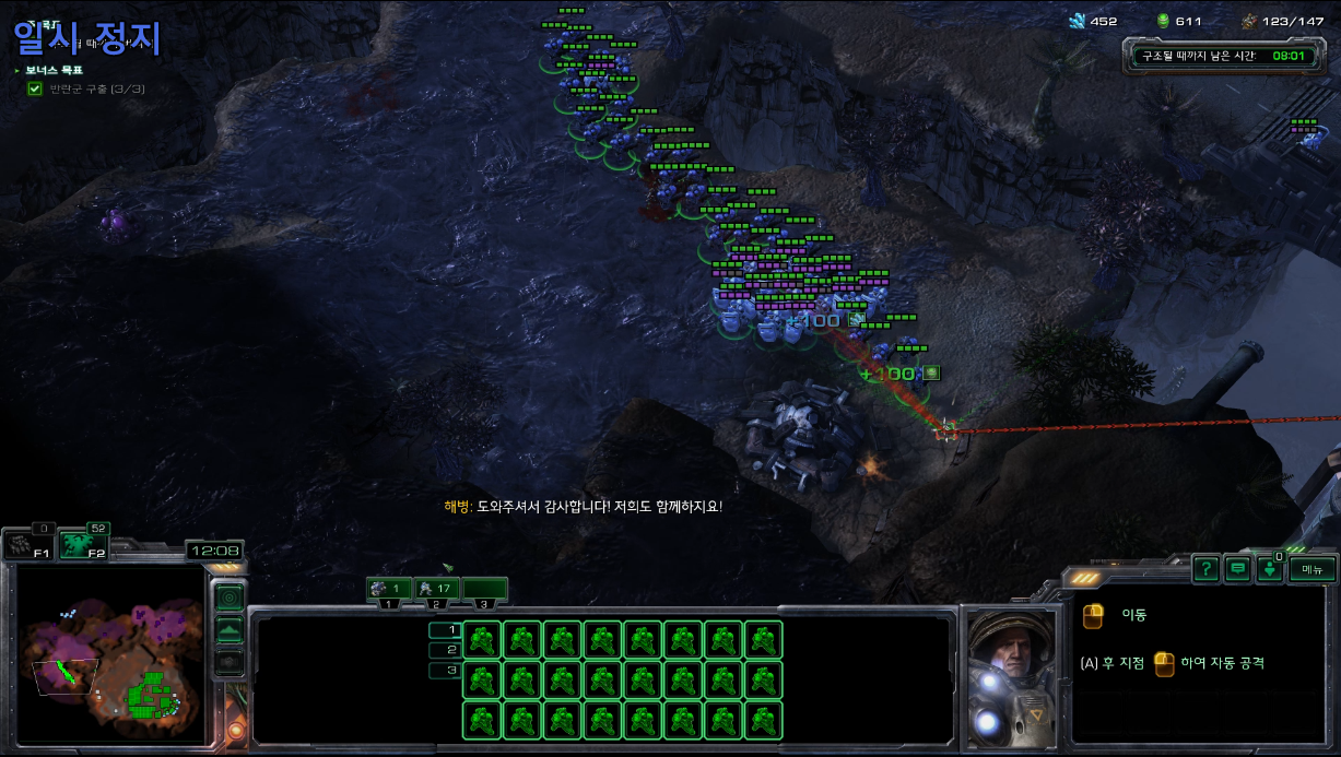 2분 25초 정도가 되면 2시 방향에서 구조요청 신호가 들려옵니다. 모아둔 해병을 데리고 구하러 갑니다.