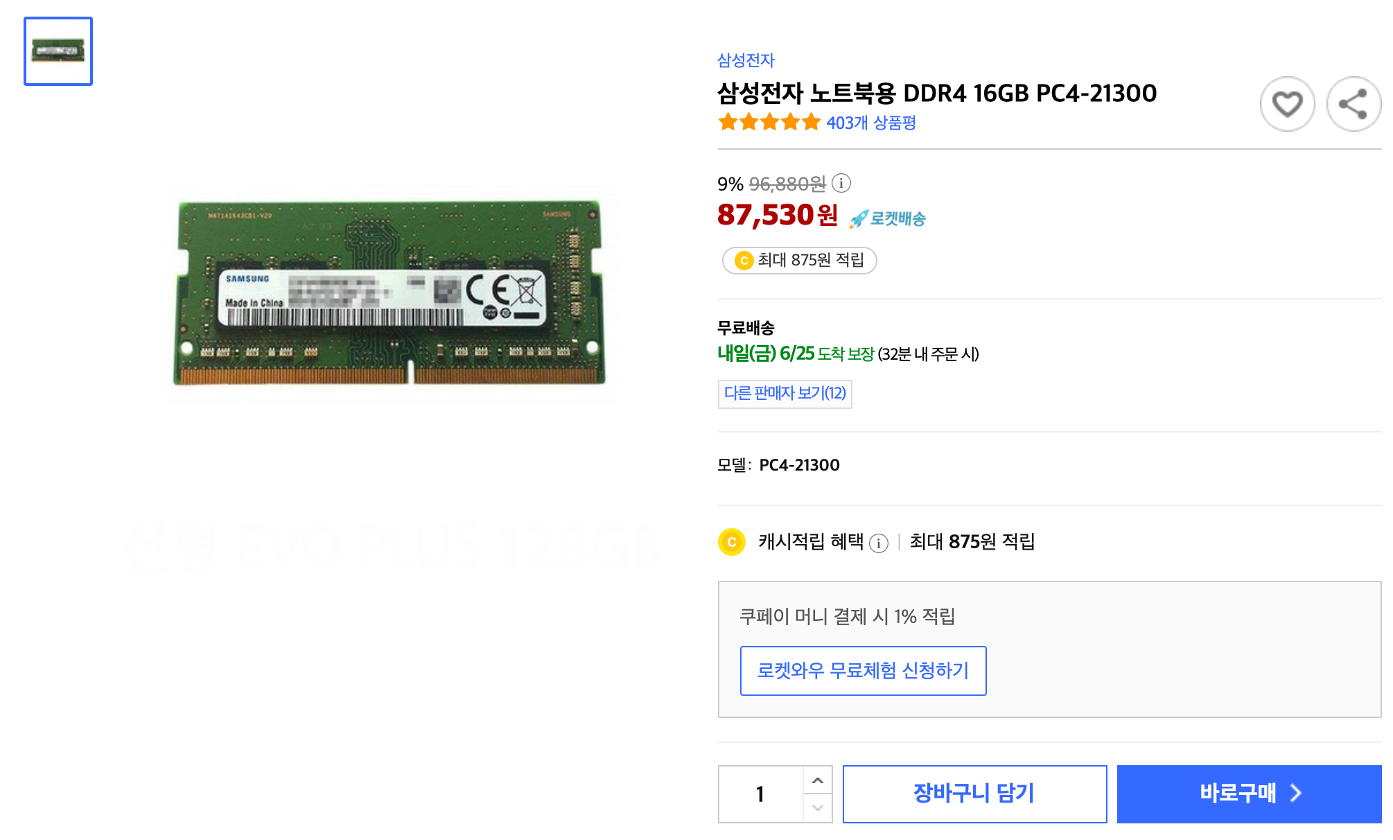 시놀로지 정품 램은 4GB짜리가 10만 원 정도로 비싼데요. 다행히 삼성전자 노트북용 메모리를 사용해도 된다는 글들이 보여서 삼성전자 메모리로 주문했습니다. 가격은 더 싼데 용량은 무려 4배입니다.