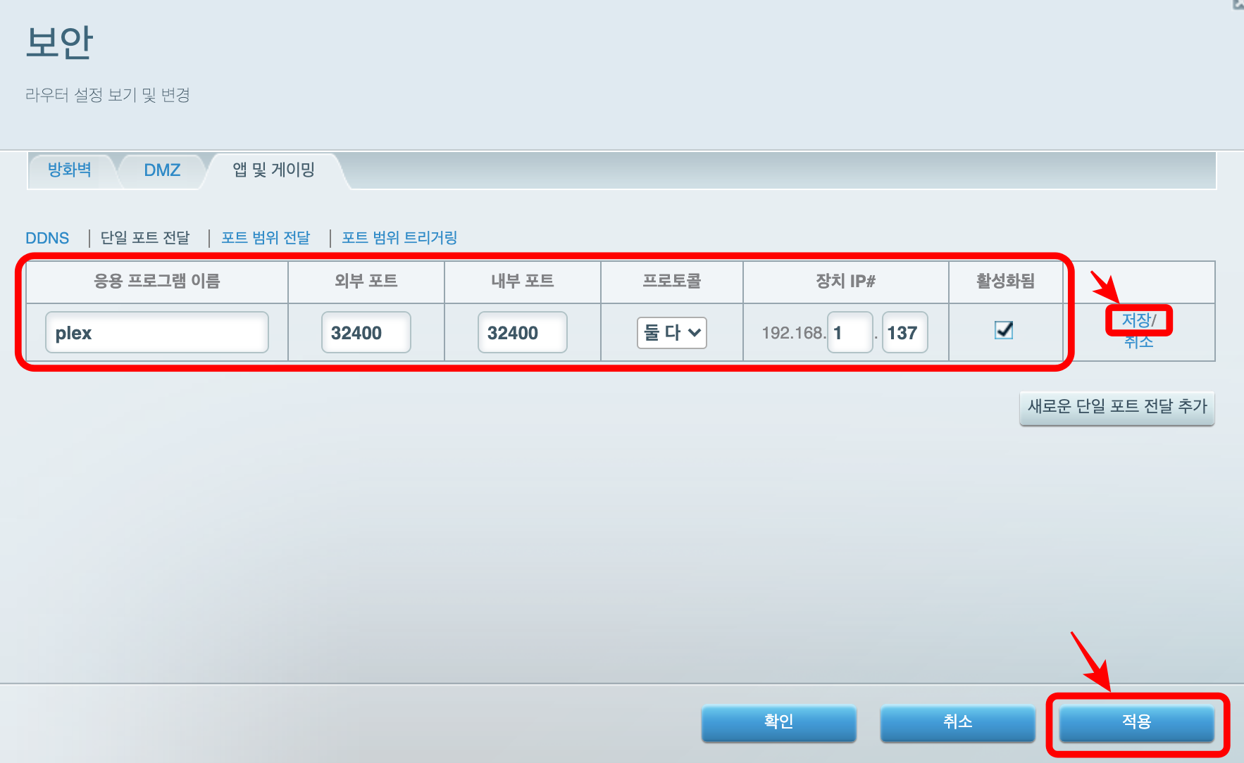 plex 포트는 32400입니다. 내부 포트를 32400으로 합니다.