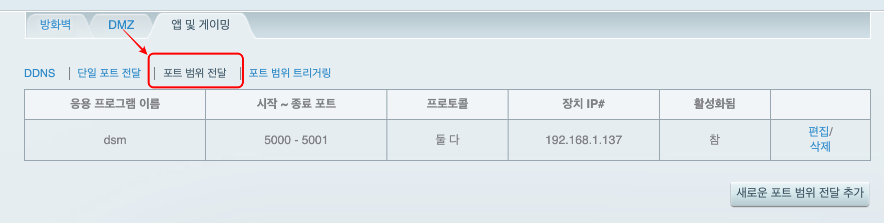 만약 포트를 변경하지 않고 특정 범위의 포트를 한 번에 설정하고 싶다면 "포트 범위 전달"기능을 이용합니다.