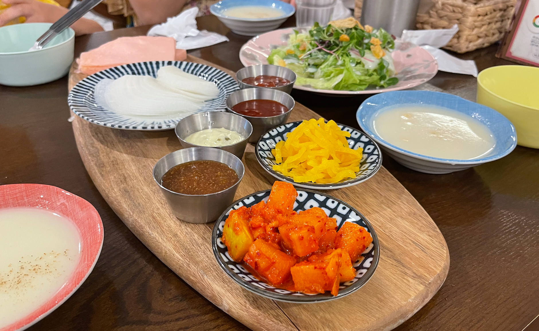 샐러드와 다양한 소스, 깍두기 등이 나오고 쌈 싸 먹을 밀전병과 무쌈이 나왔습니다.