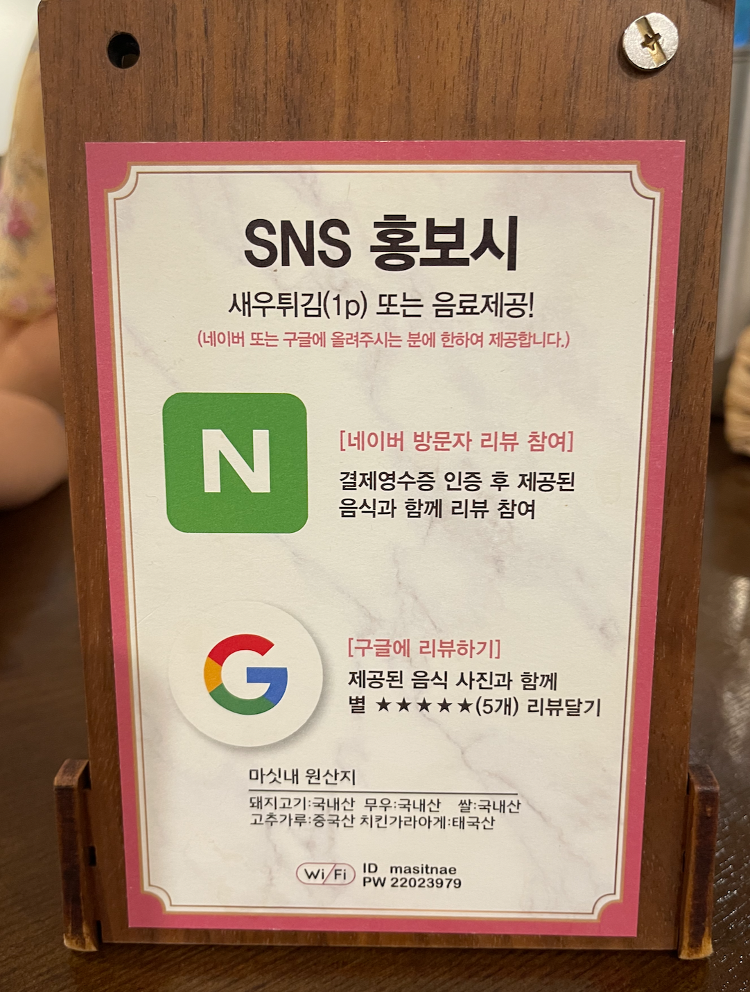 다만 영수증은 먹고 나서 받을 거 같아서 패스하고, 구글 리뷰도 음식 사진이 필요해서 음식이 나올 때까지 기다려야 했습니다.