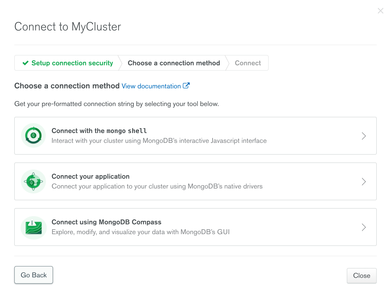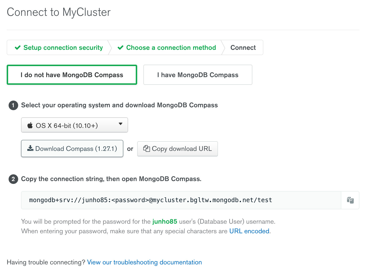 상황에 따라 접속 방법을 선택하면 되고요. 저는 3번째 GUI툴인 MongoDB Compass를 선택해 보았습니다.