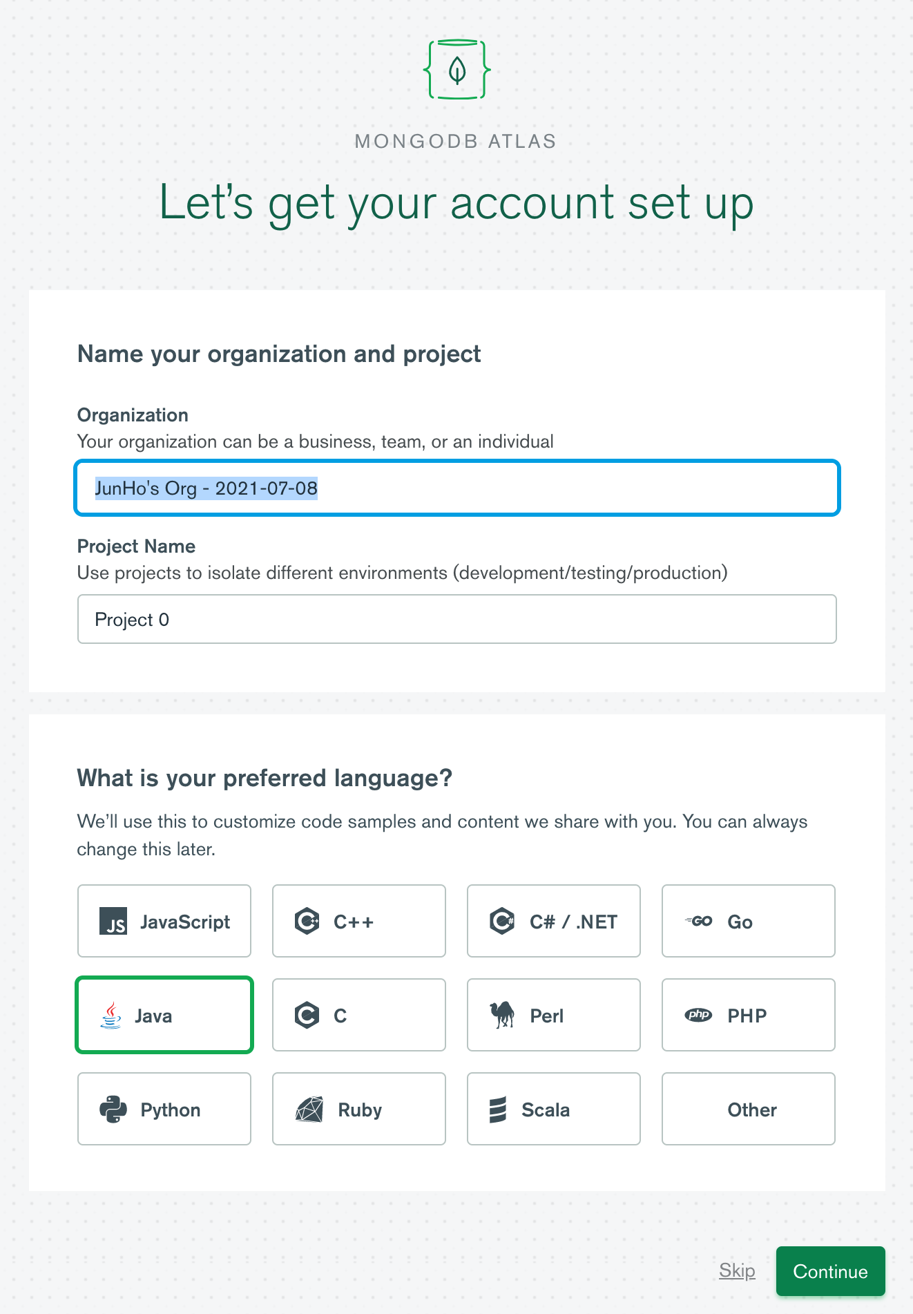 Organization, Project Name, 선호하는 개발 언어는 적당히 입력해 줍니다.