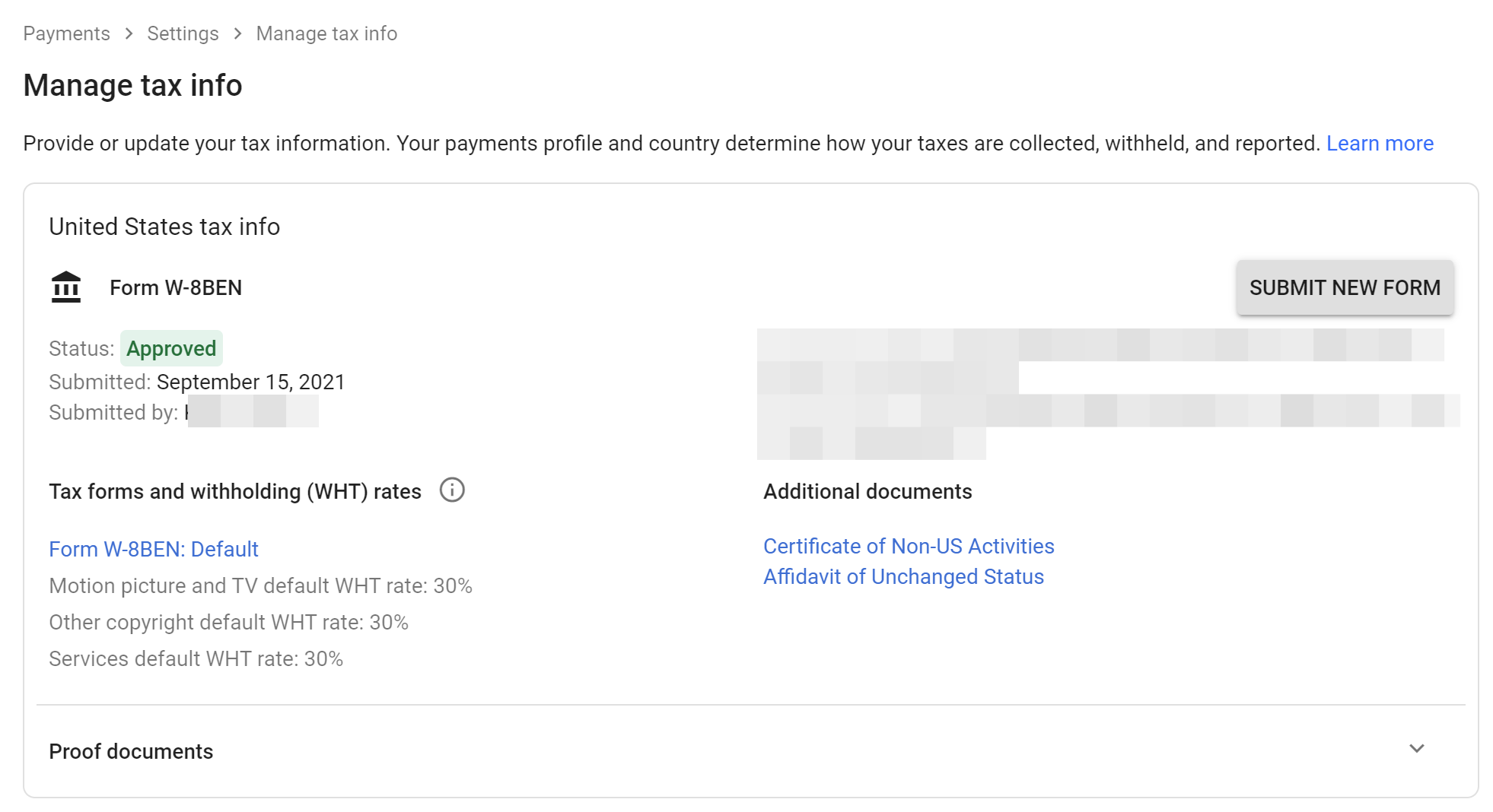 세금은 미국 내 수익에 대한 세금인가 봅니다. 제 블로그가 한글로 되어 있음에도 불구하고 미국에서 발생한 수익이 미미하게 있긴 하던데요. 거기서 세금이 좀 떼일지도 모르겠네요.