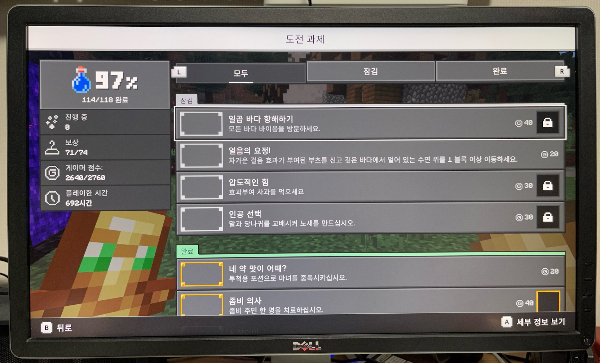 요즘은 마인크래프트 도전과제 올클리어에 도전하고 있습니다. 열심히 하다 보니 이제 4개밖에 남지 않았네요. 그런데 진도가 너무나도 안 나갑니다. "압도적인 힘"을 클리어하려고 하는데 쉬울 거 같으면서도 어렵네요.