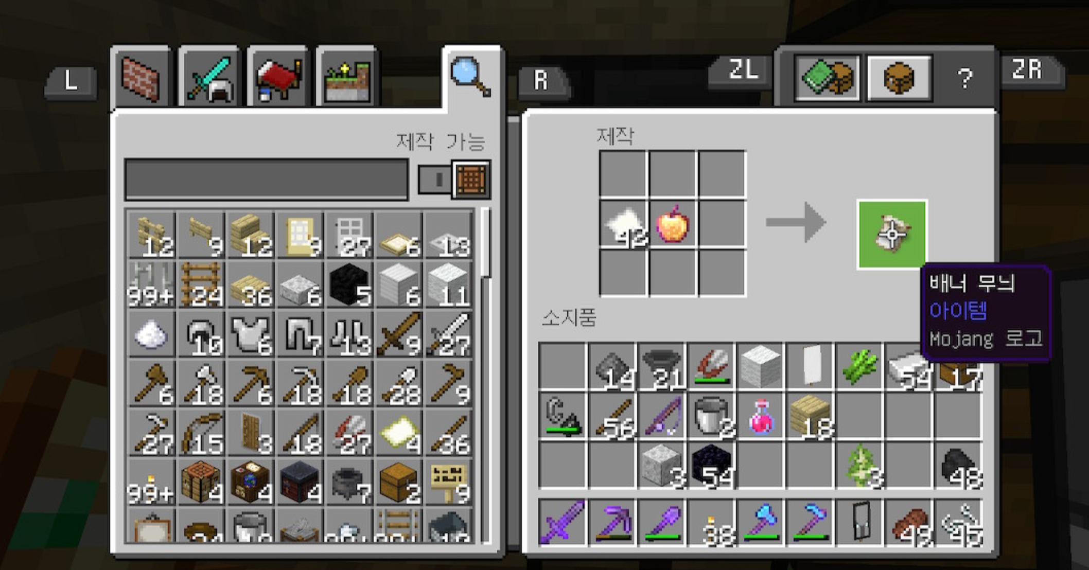 시작 지점에서 가장 가까운 삼림 대저택이 -9560, -2104였고 제 기억이 맞다면 처음으로 방문한 곳인데 여기서 "효과부여 사과"를 얻을 수 있었습니다. 그런데 다른 도전과제를 하는 데 사용했습니다. Mojang 로고가 그려진 현수막 만드는 도전과제를 하는 데 사용했었습니다.