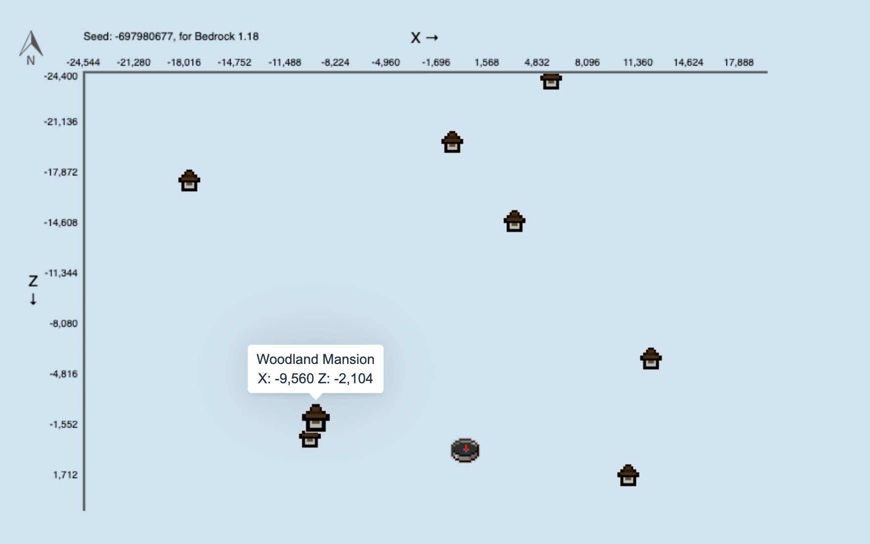 제 시드를 기준으로 삼림 대저택(Wooland Mansion)들을 위치들입니다. (https://www.chunkbase.com/apps/seed-map#-697980677)