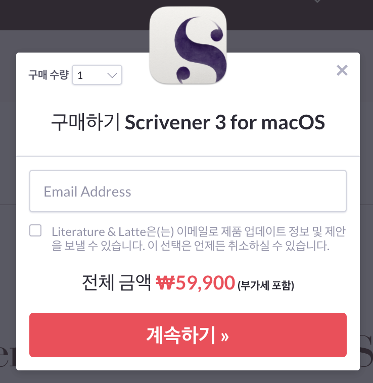 구입창이 나타나면 이메일 주소를 적고 "계속하기"를 누릅니다.