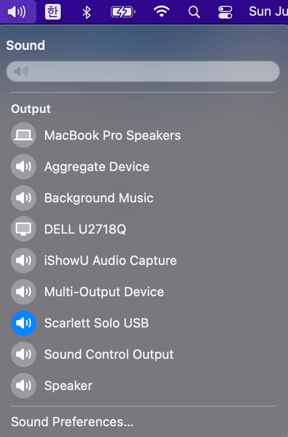 Scarlett Solo USB를 출력장치로 사용하고 있는데요. 스칼렛 솔로라는 오디오 인터페이스를 연결하면 저렇게 나옵니다. 오디오 인터페이스를 사용하면 OS 자체의 소리 조정 기능이 비활성화되더군요. 볼륨을 조절하려면 오디오 인터페이스의 볼륨 다이얼을 이용했어야 했습니다. 하지만 오디오 인터페이스 위치가 좀 떨어져 있다 보니 볼륨 조절이 불편했습니다. 오디오 인터페이스 위치를 가까이 옮겨도 되겠지만 오디오 인터페이스가 번쩍번쩍 거리는 것이 거슬렸습니다. (예민 예민)