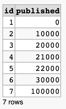 다음과 같은 데이터가 있다고 가정합니다. 최소한의 데이터만 넣었는데 published는 기사를 발행한 시각(단위: 초)입니다. 테이블명은 articles입니다.