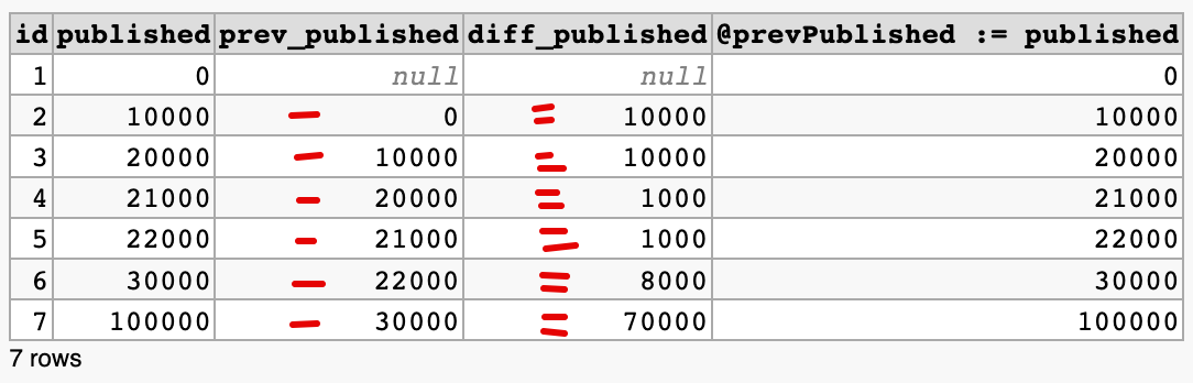 SELECT published - @prevPublished diff_published,