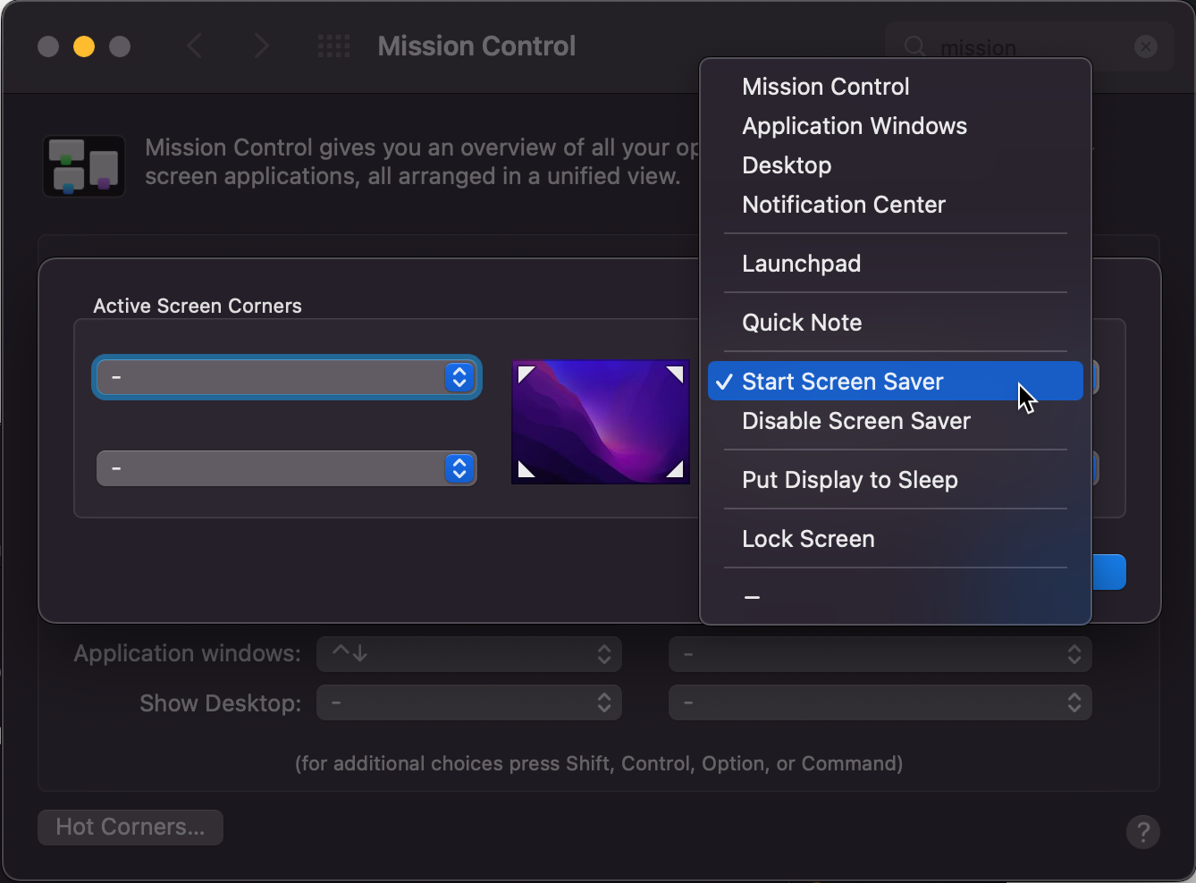 OSX 핫코너 - 마우스 커서를 코너에 가져다 두면 화면 보호기가 실행되도록 본문