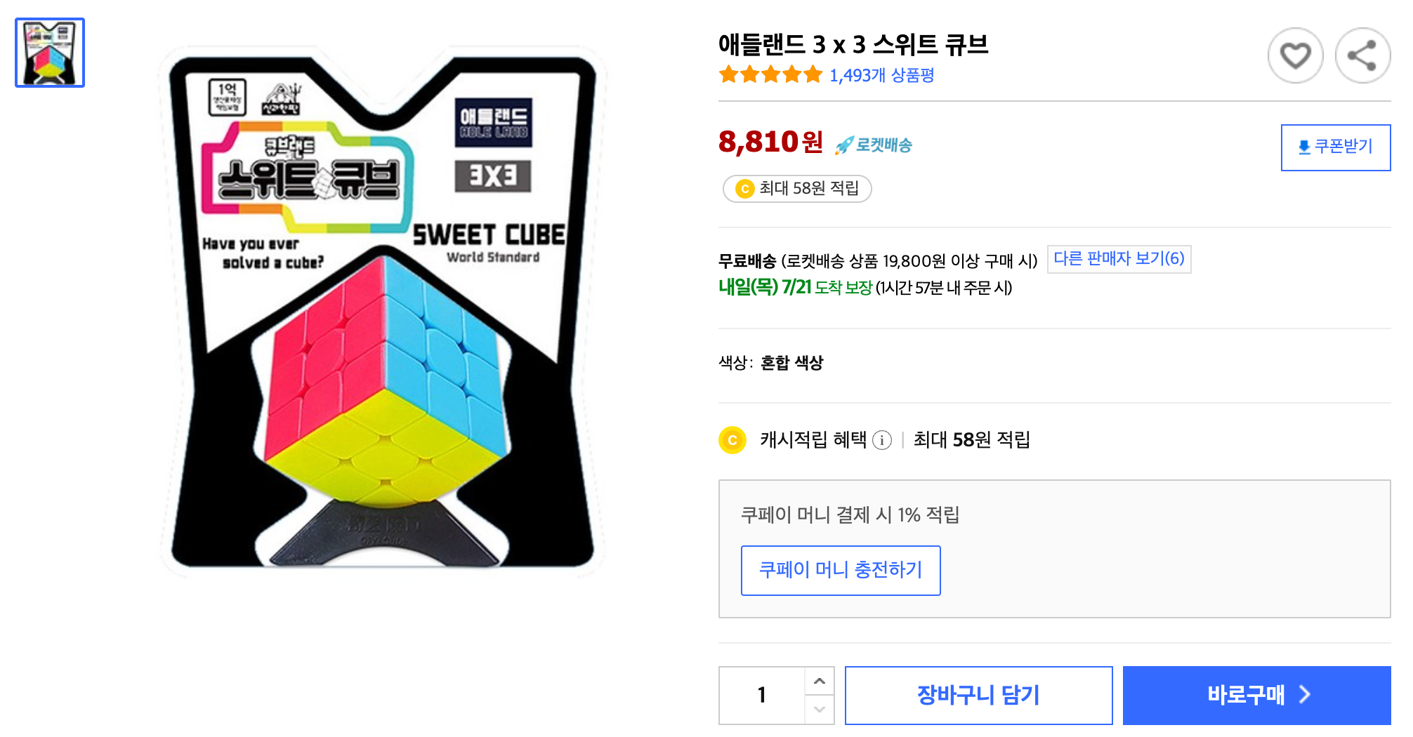 스티커가 붙어 있는 방식이 아니고 블록 자체에 색이 입혀져 있어서 스티커 떨어질 걱정은 없겠네요. 제가 큐브 고수가 아니다 보니 잘은 모르겠지만 저가형 큐브 중에는 잘 돌아가는 거 같습니다. 저가형 큐브 중에는 뻑뻑해서 잘 안 돌아가는 경우도 있는데 이 큐브는 잘 돌아갑니다. 아이들도 만져 보더니 갖고 싶어 하네요.