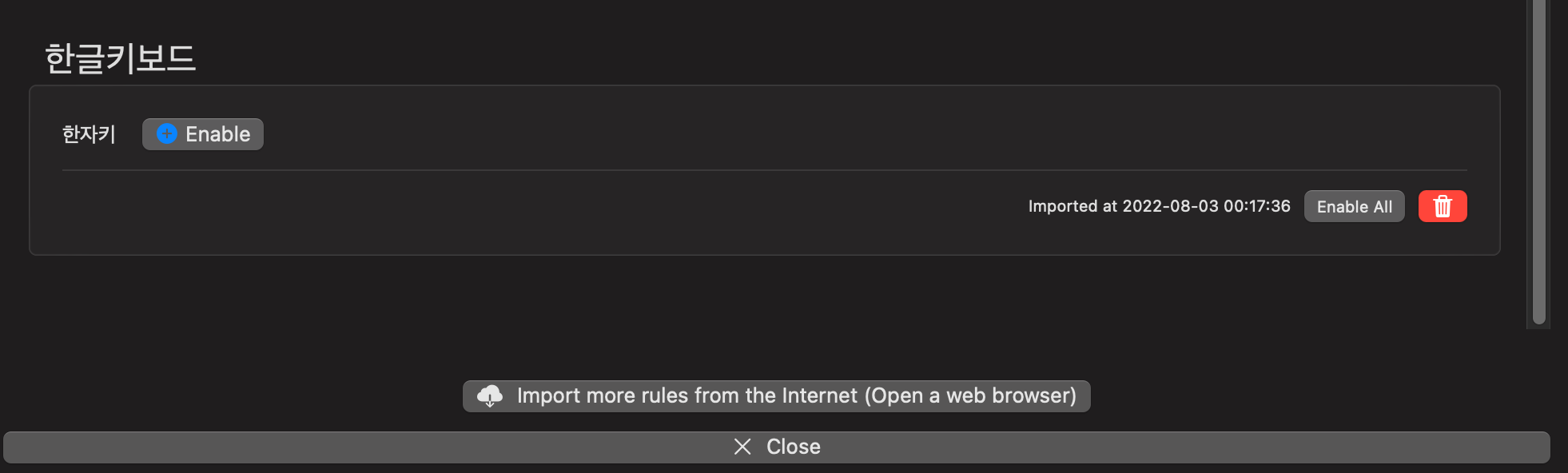 Karabiner-Elements에 Complex Modifications에 룰을 Import 하는 화면이 나타납니다.