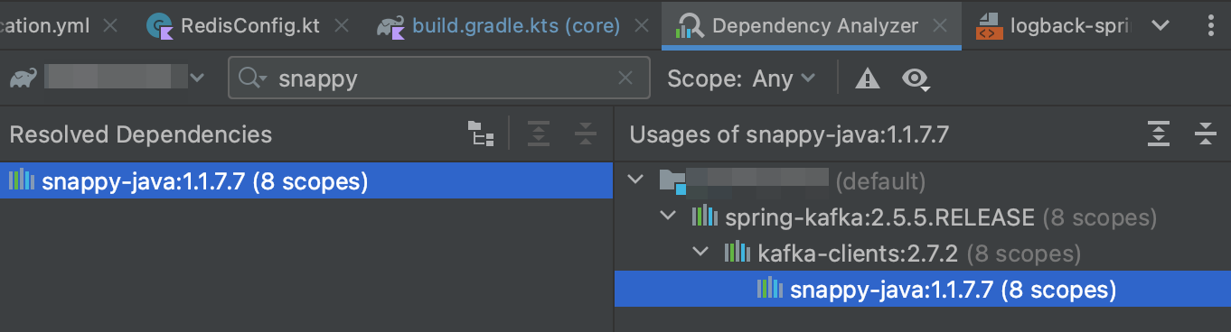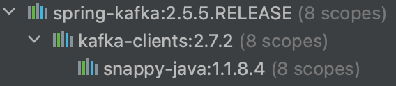 spring-kafka > kafka-clients > snappy-java 순서로 참조하고 있습니다.