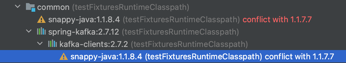 spring-kafka 말고 모든 곳에 snappy-java의존 관계가 있는 것처럼 보입니다. 게다가 어떤 곳은 충돌이 난다고 나옵니다.