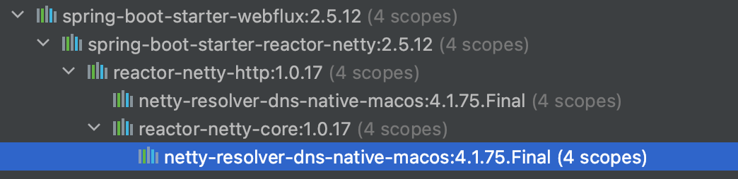 디펜던시 관계를 찾아보면 spring-boot-starter-webflux > spring-boot-starter-reactor-netty > reactor-netty-http > reactor-netty-core > netty-resolver-dns-native-macos를 찾을 수 있습니다.