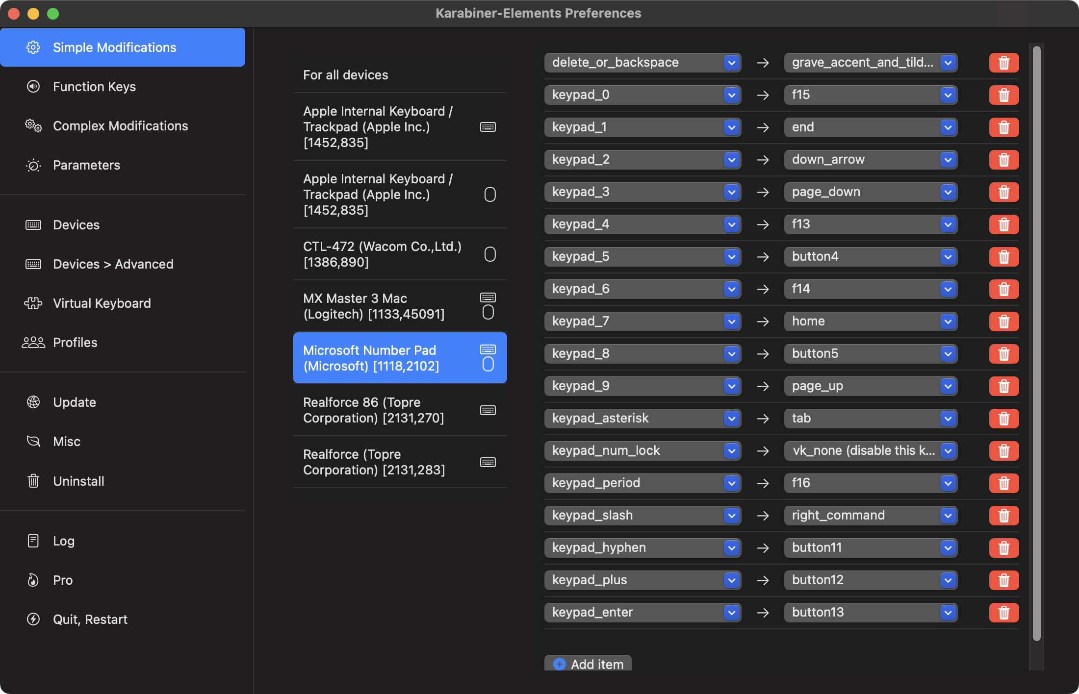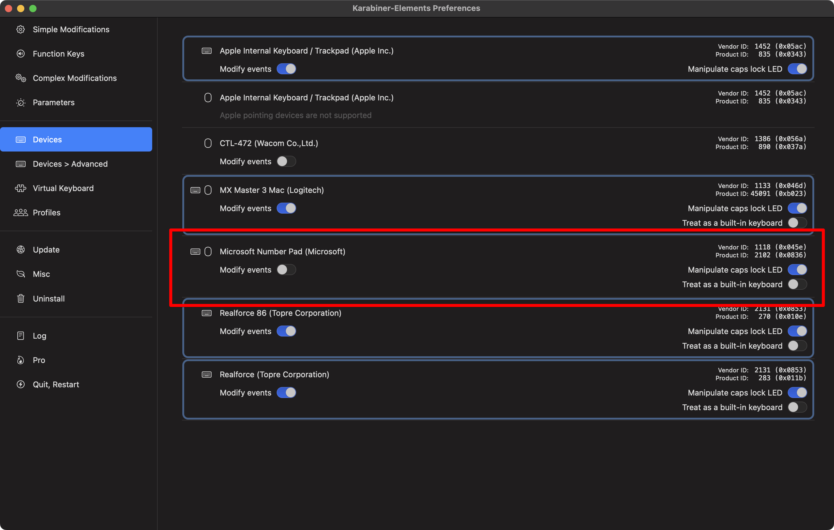 자, 설정 들어갑니다. 무선 기기라서 그런지 모르겠지만 기본적으로 Karabiner-Elements에서 비활성화되어 있습니다. Devices설정으로 들어가서 Microsoft Number Pad (Microsoft) 설정의 Modify events설정을 활성화해줍니다.