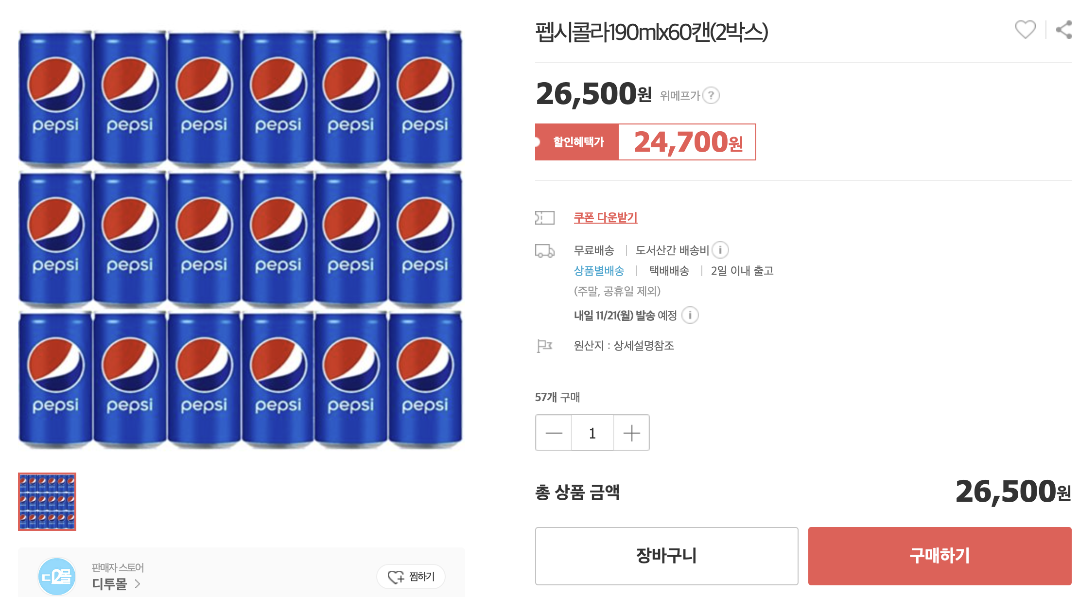 2022.07.02 이마트 트레이더스 구입 기록 확인 코카콜라 215밀리 30입 19480원 - 2600원 16880원에 30개이니 개당 562.66666... 원 1밀리당 2.617... 원 쿠팡 펩시콜라 190ml 30캔 쿠팡 구매 링크: https://link.coupang.com