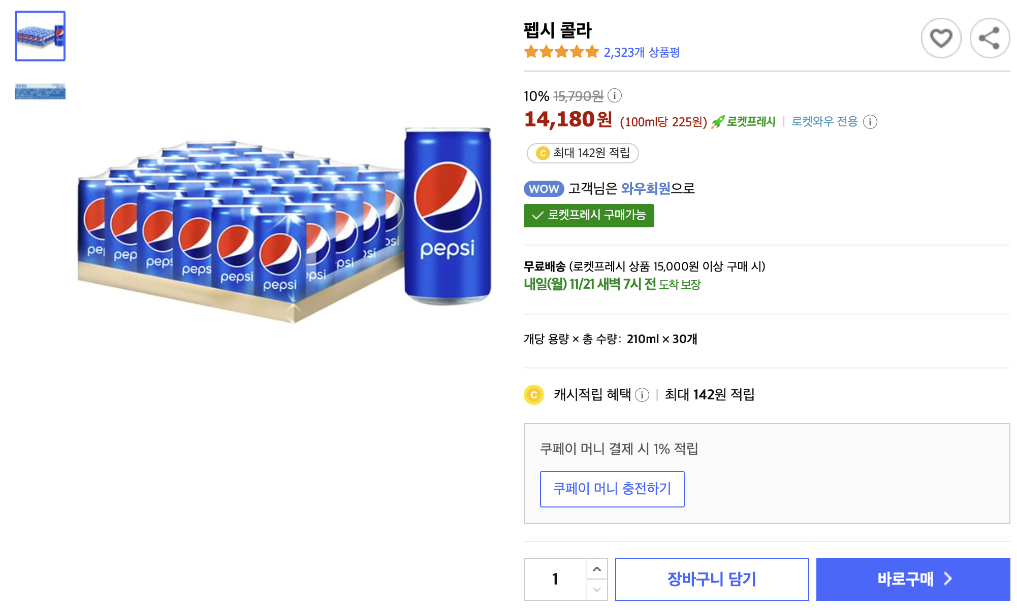 (후보) 쿠팡 펩시 콜라 210ml x 30개 로켓 배송 2개