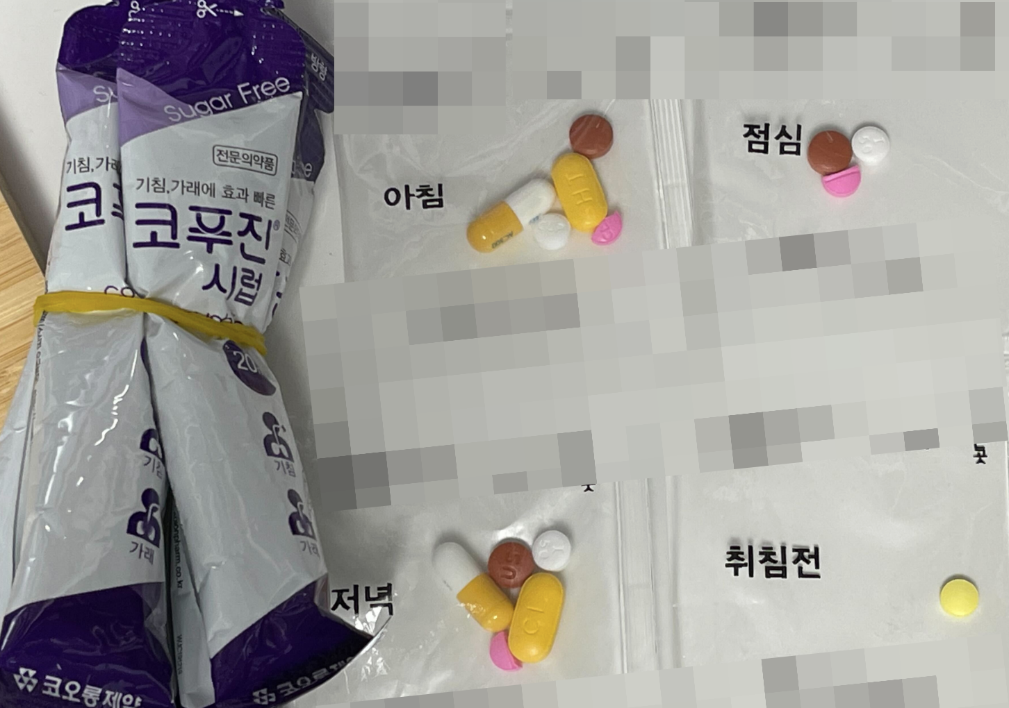 저녁 먹기 전에 토했습니다. 저녁 먹고 약 먹다가 토했습니다. 점심에 약을 먹다가 토해서 이번에는 약을 좀 천천히 먹었습니다. 한 번에 털어 먹지 않고 조금씩 나눠먹었습니다. 코푸진시럽을 조금 먹다가 토했습니다. 토하고 나서 나머지 약을 먹었는데 다행히 토하지는 않았습니다.