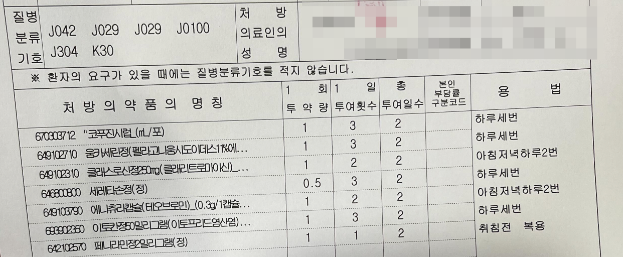 처방전을 보니 질병 분류 기호는 지난번과 같습니다. 다른 게 온 거 같다고는 하지만 같은 증상 범위인가 봅니다.