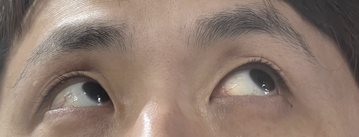 안구 검사는 의사 선생님이 손가락을 여기저기 가리키며 눈을 좌상, 우상으로 돌리도록 지시하시더군요. 집에 와서 사진으로 찍어 보니 안구 바깥쪽이 조금 노래 보이고 핏줄이 많이 생긴 거 같기는 합니다. 아내가 말하기로는 어제즈음인가 제 눈 색깔이 많이 변했었다는데 제가 제 눈을 보지는 못했었어서 잘 모르겠네요.