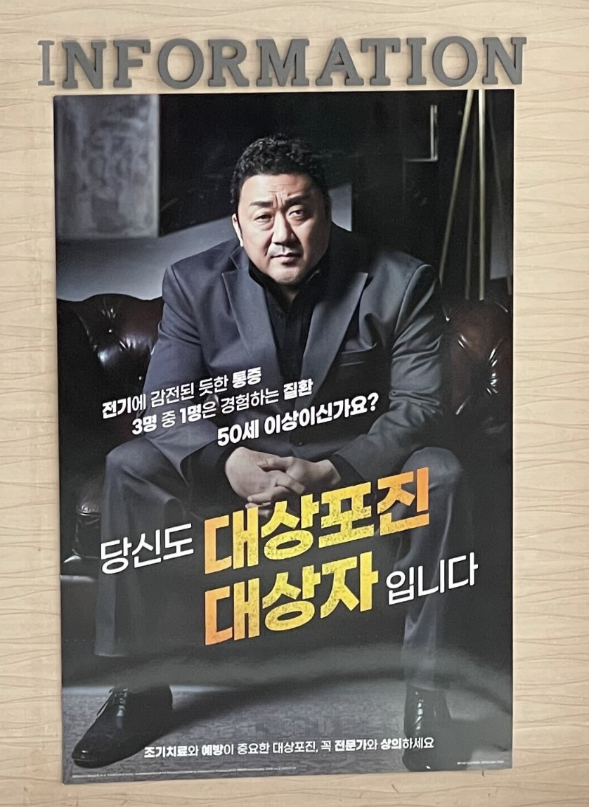 병원에 대상포진 포스터가 붙어 있었습니다. 예전에 20대 때 대상포진에 걸렸던 적이 있었습니다. 몸의 일부분에 수포가 나서 쯔쯔가무시병이 아닐까 의심도 했었지만 대상포진이었습니다. 병원에서는 생각지 못했는데 혹시 또 대상포진이 온 게 아닐까 문득 생각이 들었습니다. 다행히 수포 같은 게 보이지는 않았습니다.