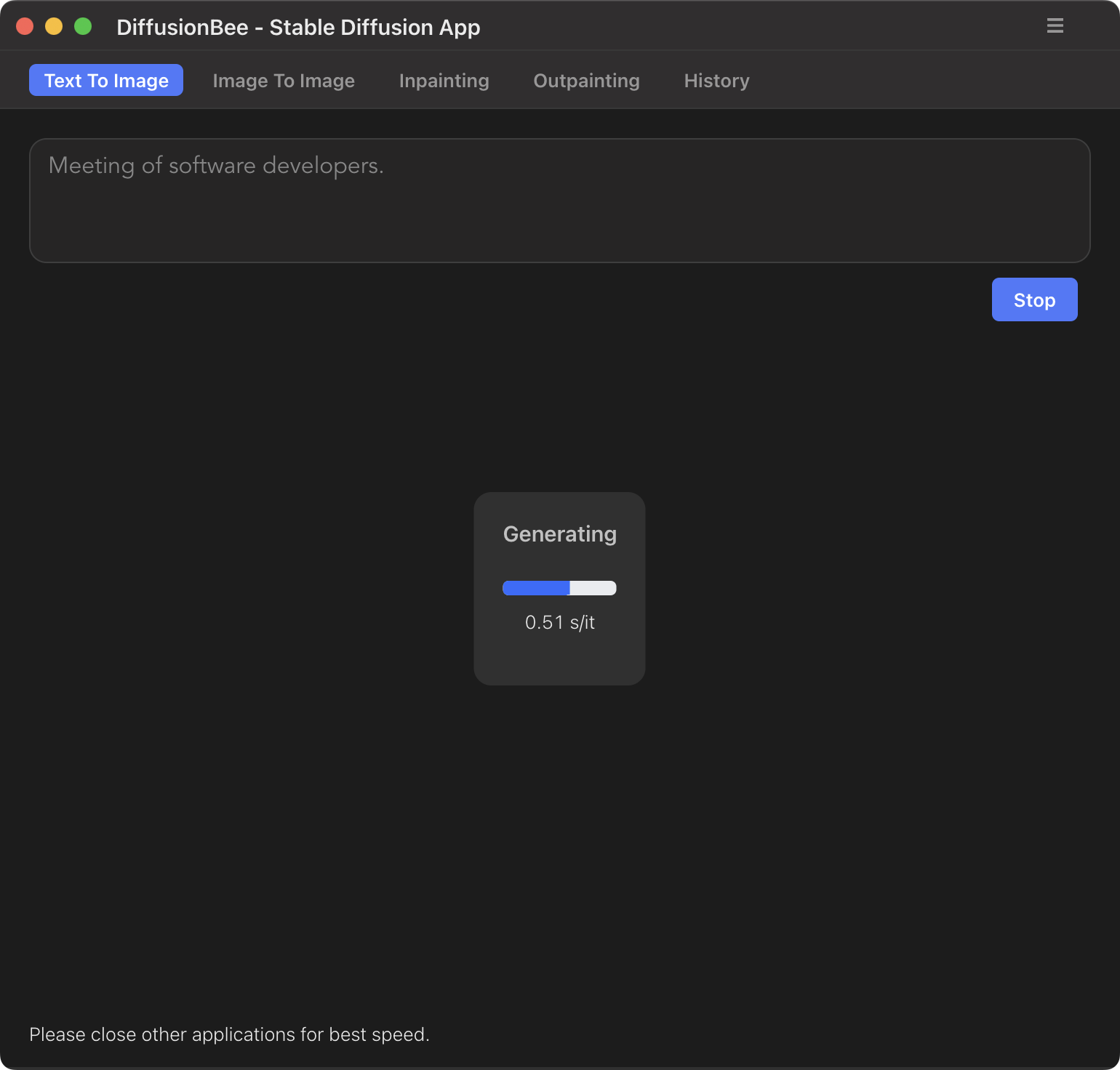 텍스트를 입력할 수 있는 부분에 Prompt를 입력합니다. 간단히 "Meeting of software developers."라고 입력하고 "Generate"버튼을 눌러 이미지 생성을 시작합니다. 아래 화면처럼 Generating이라는 문구가 보이고 이미지가 생성되는 프로그래스바를 볼 수 있습니다.