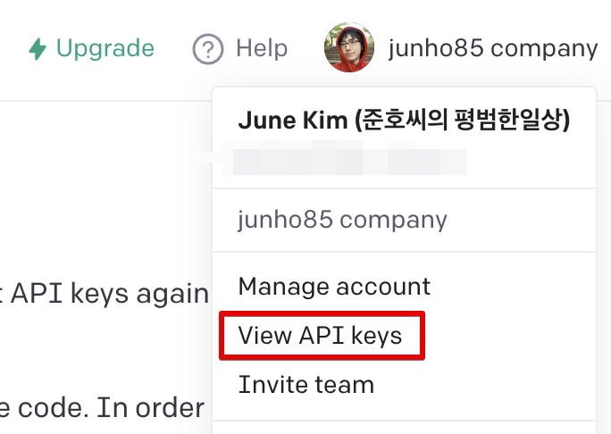 API를 사용해 보려면 API Key를 발급받아야 합니다. 우측 상단에 메뉴를 누르면 View API Keys메뉴를 눌러서 들어갑니다.