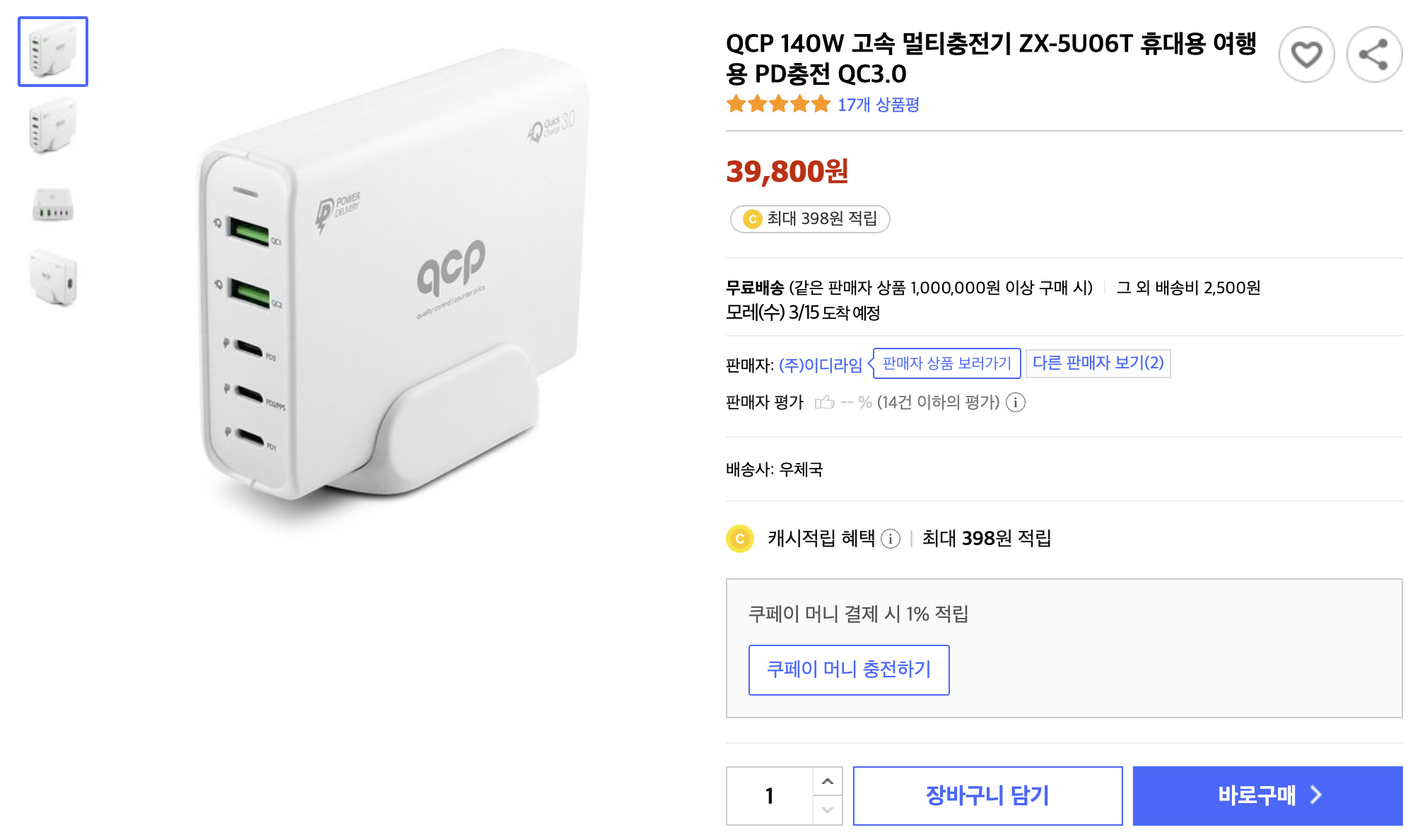 작년에 쿠팡에서 만듦 ZX-5U06T 충전기를 구입해서 사용해 보니 괜찮아서 4개 정도 구입해서 회사, 아이들 방, 거실, 작업실에 두고 사용했었는데요. 작업실에서 하나 더 사용하고, 안방에서도 사용하기 위해 2개를 더 구입했습니다.