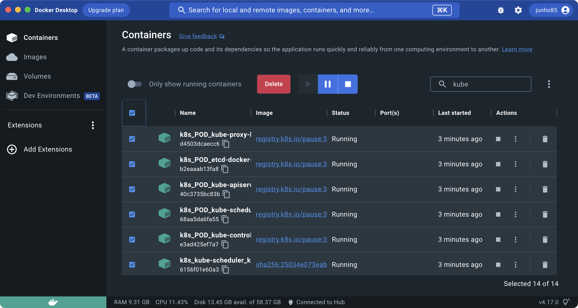 나가서 Containers에서 "kube"가 들어간 것들을 검색해서 삭제를 시도해 보았습니다.