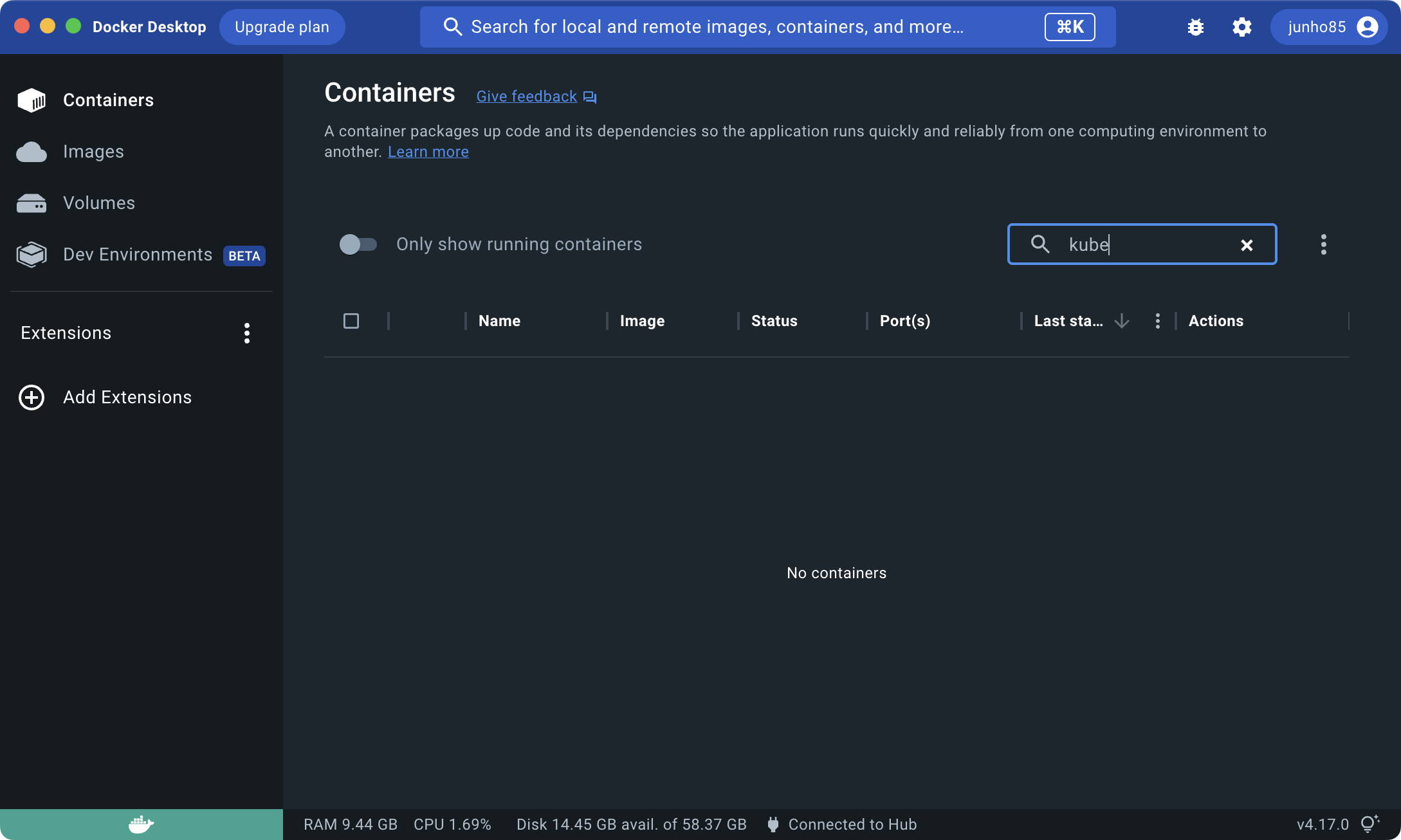 Docker Desktop의 Containers에도 이제 kube와 관련된 container들이 더 이상 나타나지 않는 것을 확인할 수 있습니다.