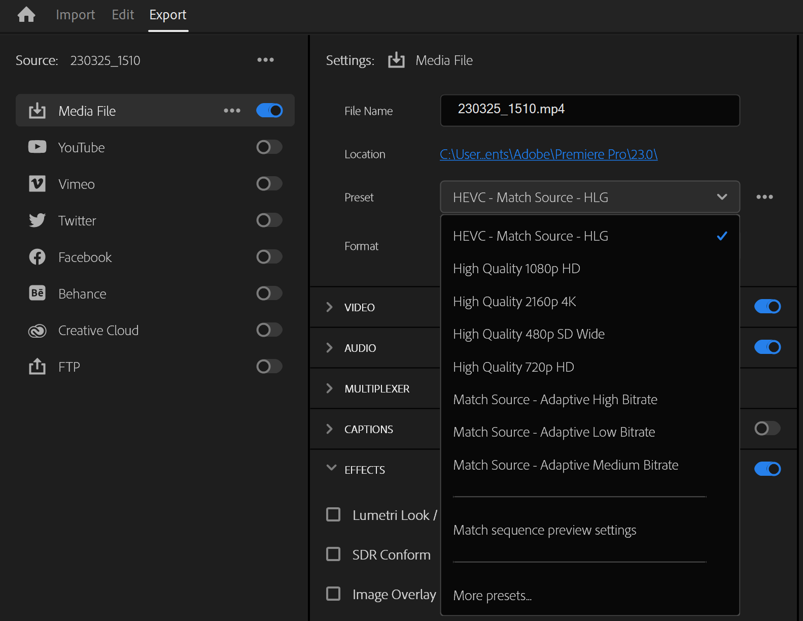 Export 할 때 Lumetri Look / LUT을 설정할 수 있습니다.