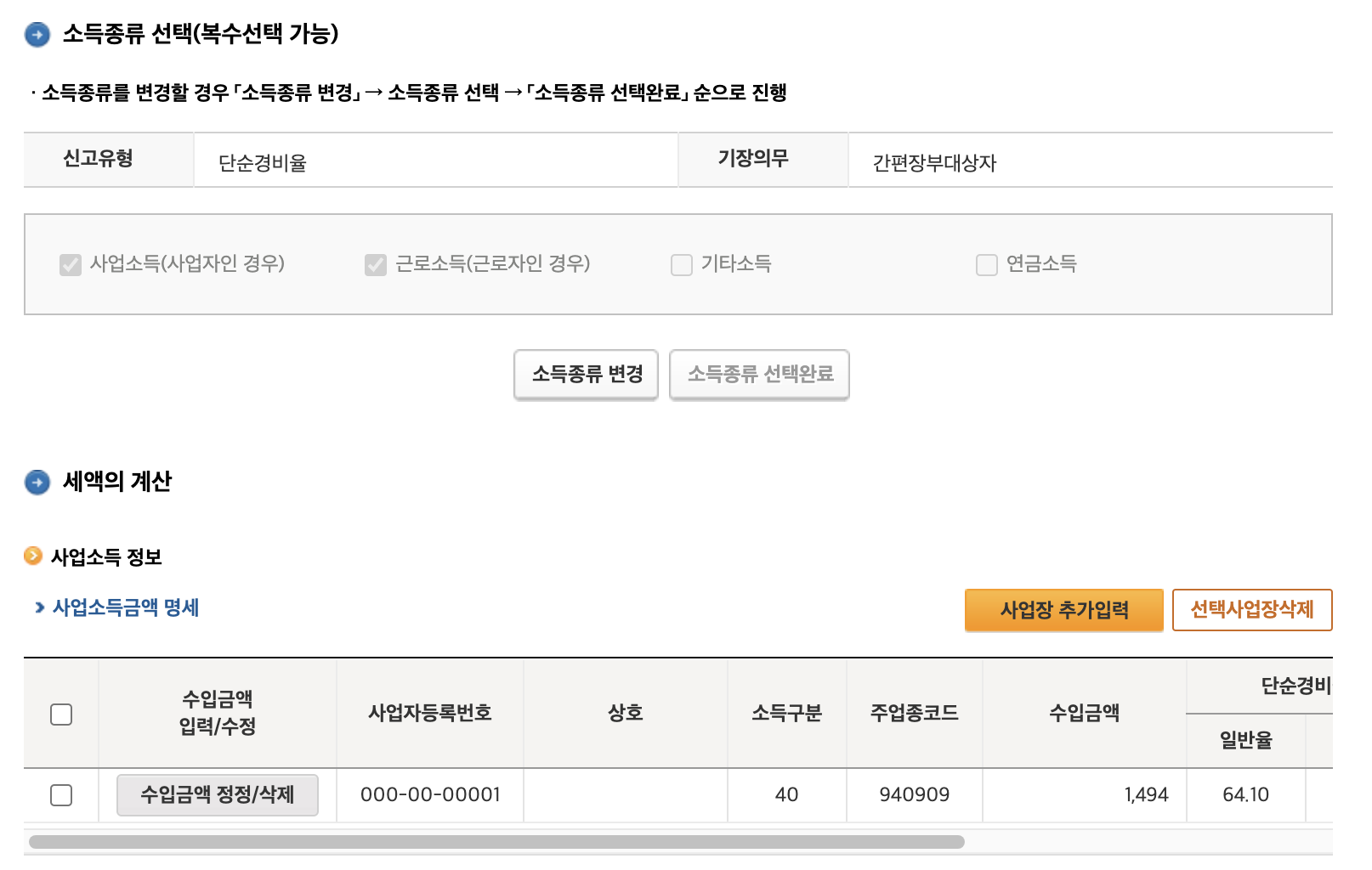 종합소득세 신고 초보일 때 가장 힘든 게 소득구분이나 주 업종코드 같은 것을 뭘 사용해야 되는지인데요. 알아서 입력되어 있으니 편리합니다.