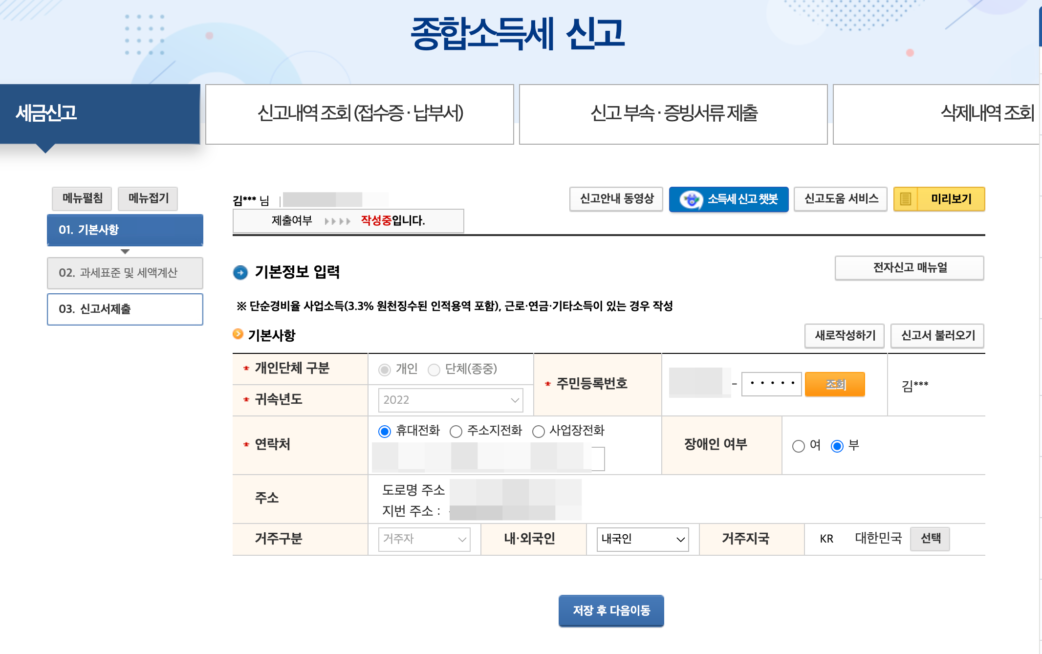 "예(신고하기)"버튼을 누르면 기본사항을 입력하는 화면으로 이동합니다.