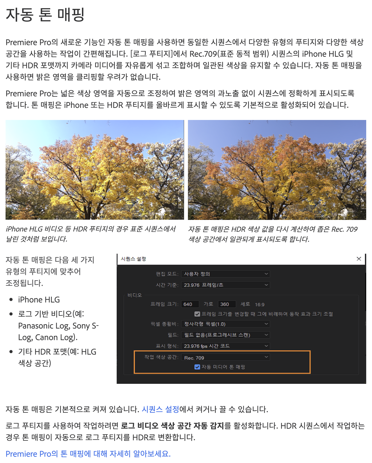 그런데 이번에 프리미어프로에서 자동 톤 매핑이라는 기능이 추가되었습니다.