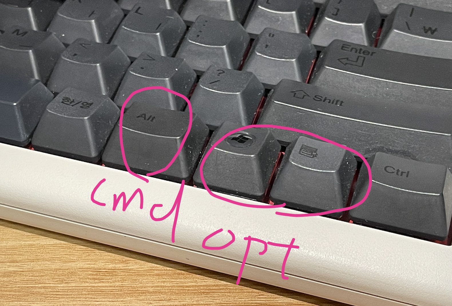 그래서 왼손으로 CMD키를 사용하지 않기 위해 오른손으로 CMD키를 사용하려고 노력 중인데요. 문제는 저는 오른손으로 한/영키를 사용하는 것을 선호하는데 제가 사용하는 키보드들이 한/영, CMD, OPT, CTRL을 모두 만족하는 경우가 잘 없었다는 것이었습니다.