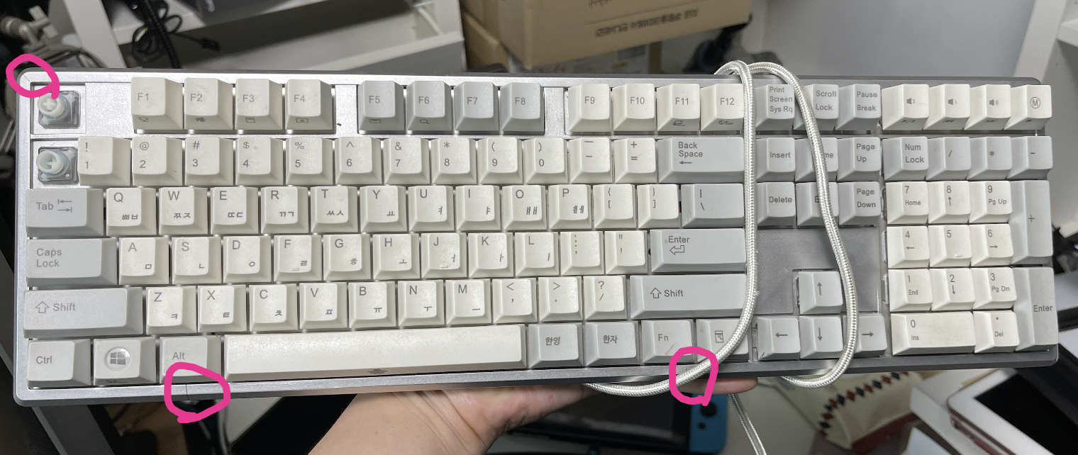 아내 작업용으로 사서 사용하다가 첫째 아이 컴퓨터에 사용했었다가 첫째도 요즘은 노트북을 주로 사용하다 보니 이 키보드는 안 쓰게 되어 제가 가져왔습니다. 하지만 세월이 흘러 여기저기 파손이 되었는데요. 수리가 가능한지도 모르겠고 수리해서 쓸지 버려야 할지 조금 고민이네요. 아무래도 버리게 될 가능성이 높아 보입니다. 아마 다른 키보드의 부품용이 될 거 같습니다.