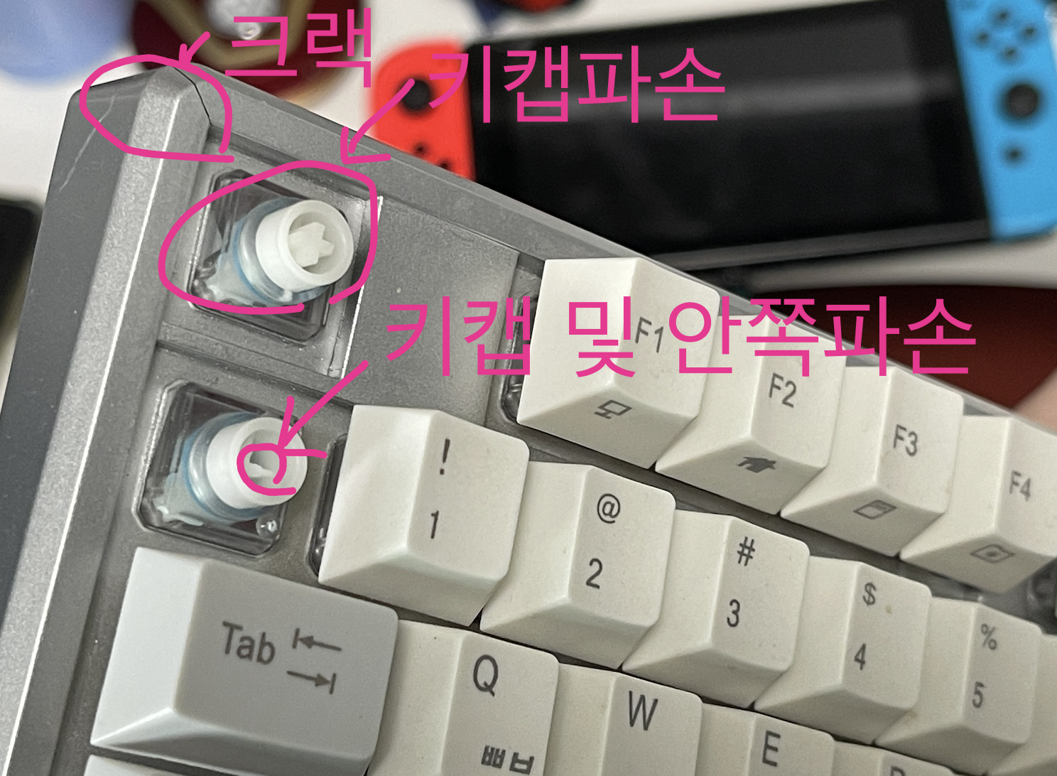가장 큰 문제는 백틱(`) 키 부분은 십자 부분까지 파손되어서 저걸 수리하려면 버튼부를 통째로 뜯어내서 교체를 해야 될 거 같은데 제가 저기까지 수리할 능력이 될지는 모르겠습니다.